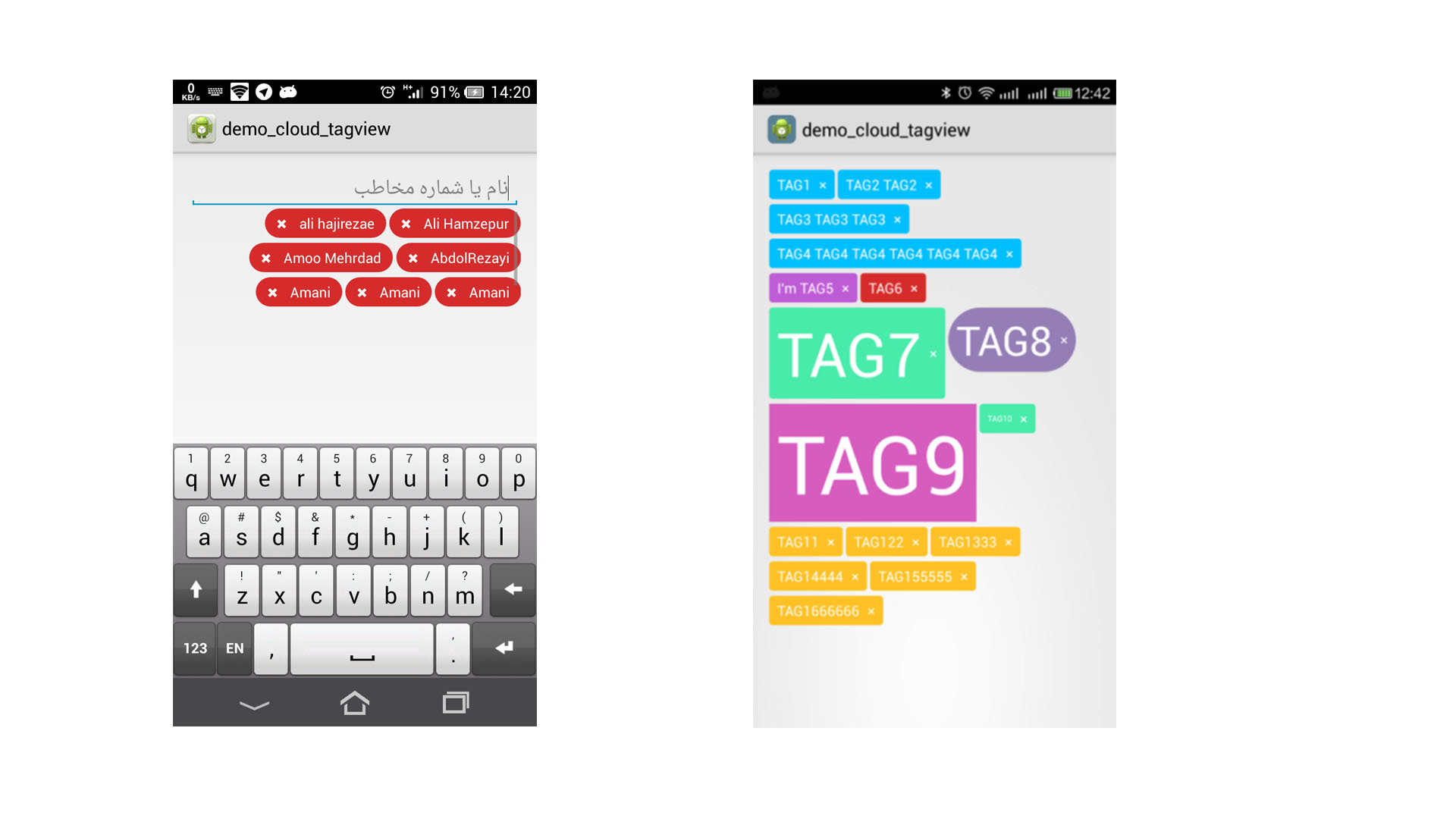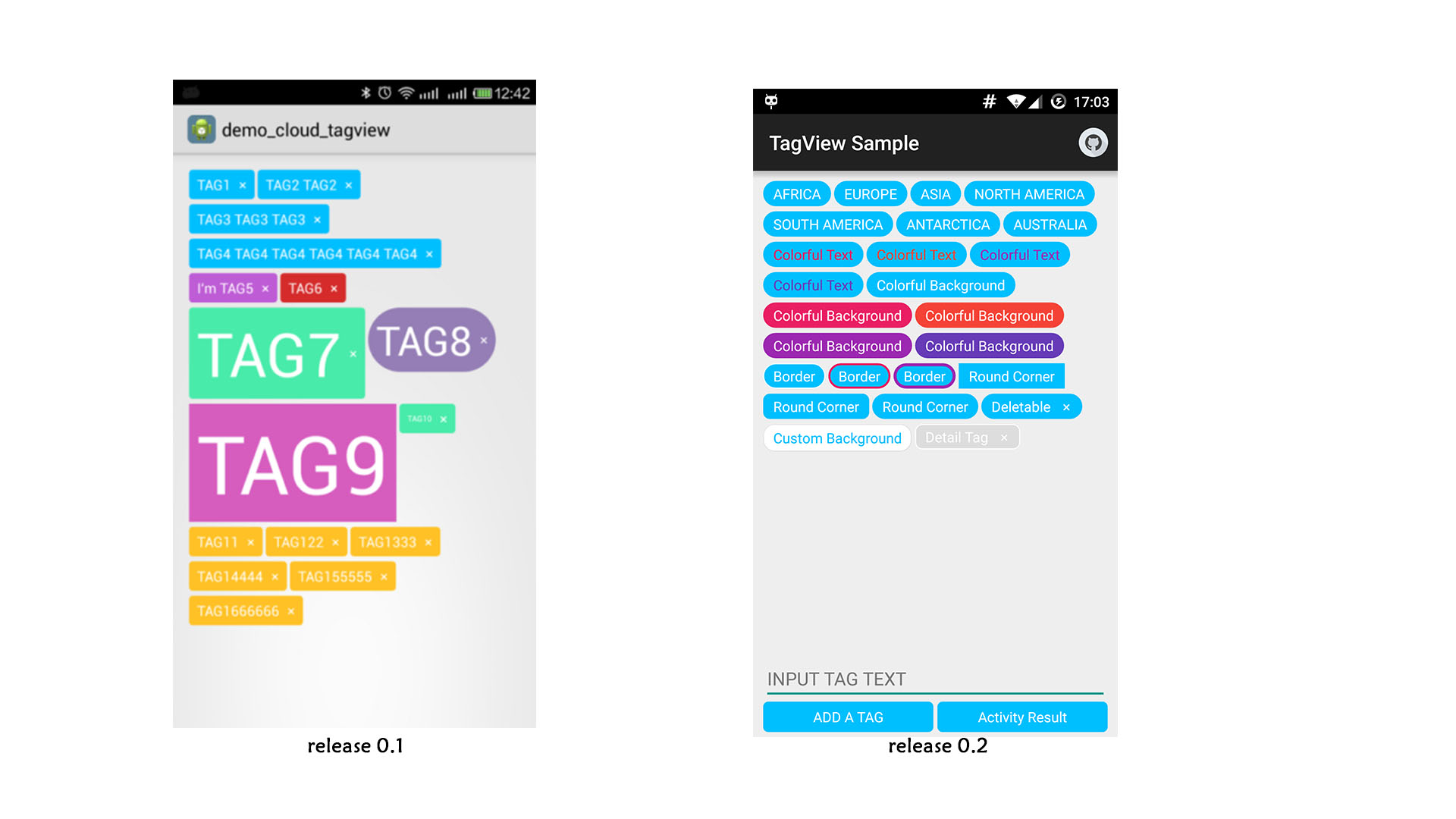 TagView tagview2 = new TagView(this); tagview2.setLineMargin(20f);//dp tagview2.setTagMargin(20f); tagview2.setTextPaddingLeft(20f); tagview2.setTextPaddingTop(20f); tagview2.setTextPaddingRight(20f); tagview2.setTexPaddingBottom(20f);